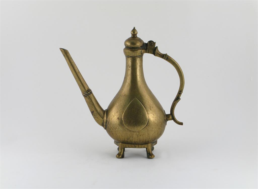 A Persian bronze ewer, the pear-shaped body lightly engraved with geometric designs, standing on four feet, with a hexagonal spout, 18th /19th century, 29.5cm.