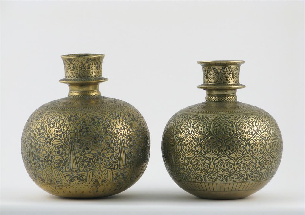 Two Indian brass hookah bases, each engraved with stylized flowers and leaves, 19th century, 15.5cm. (2)