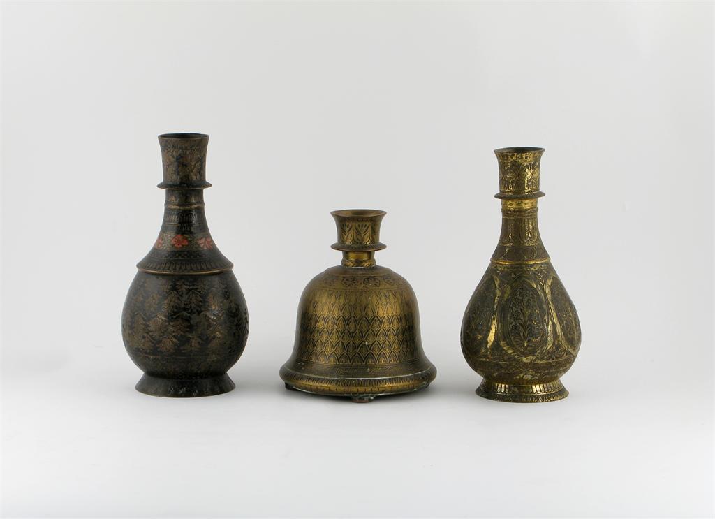 Two Middle Eastern brass bottles, and a hookah base, all decorated with stylized flowers and geometric motifs, 19th century, some damages, 22.5cm max. (3)