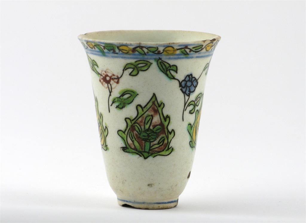 A Kutahya pottery beaker, with a slender body, flaring towards the rim, painted with four large leaf and flower motifs and bordered by leaves, 18th century, small rim chips, 8.5cm.