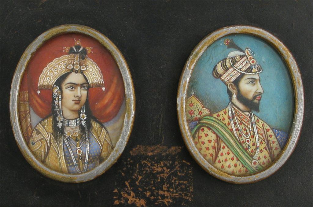 Three Indian miniature portraits, two mounted together, the third within a carved wood frame, together with a small painting on ivory of four figures on a veranda, 19th and 20th centuries, 20cm max. (3)