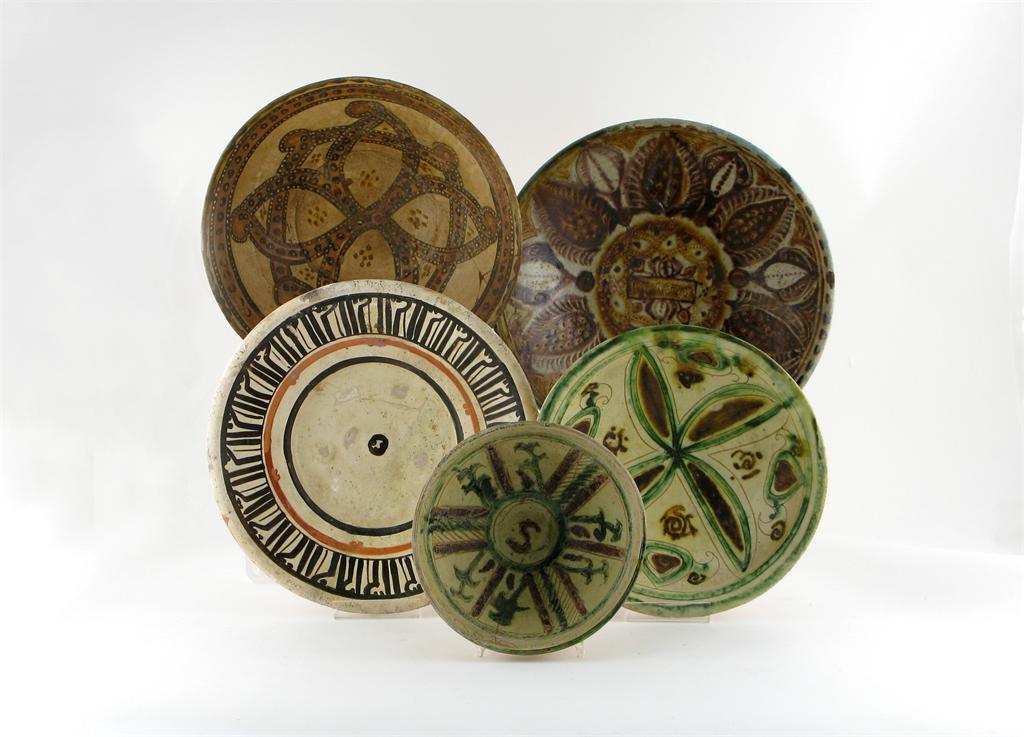 Five Middle Eastern pottery bowls, variously decorated with stylized foliate designs and calligraphy, 10th century and later, damages and repairs, 29cm. (5)