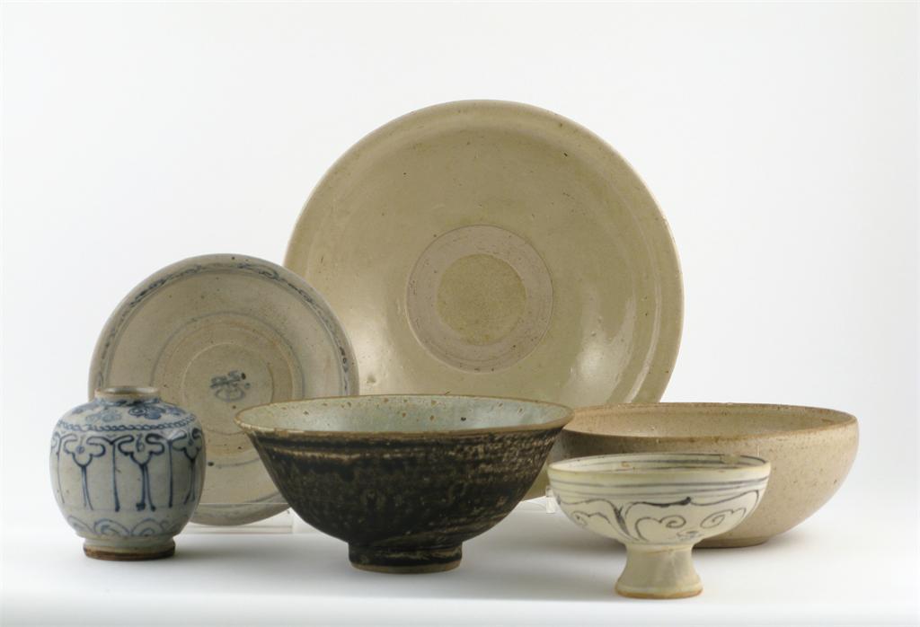 Four Annamese bowls, a stem bowl and a small blue and white jarlet, 14th/15th century, the stem bowl with a paper label for Bluett London, 23cm. (6)