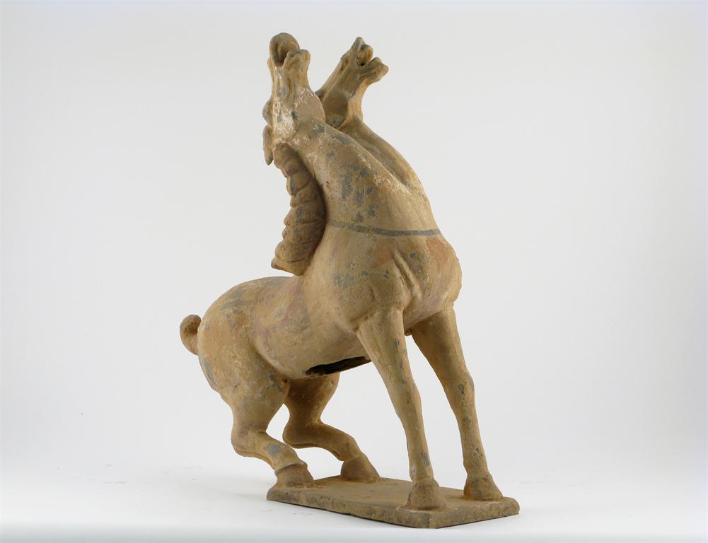 A Chinese Tang-style two-headed horse, throwing its heads back and squatting on its hind legs, traces of red, orange and white pigment, 42cm.