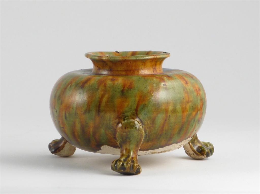 A Chinese sancai glazed tripod censer, with a compressed globular body, the feet shaped as paws, Tang dynasty 618-907 AD, some firing faults where the feet meet the body, 9.5cm. Oxford Authentication thermoluminescence analysis report sample number: C105u5.