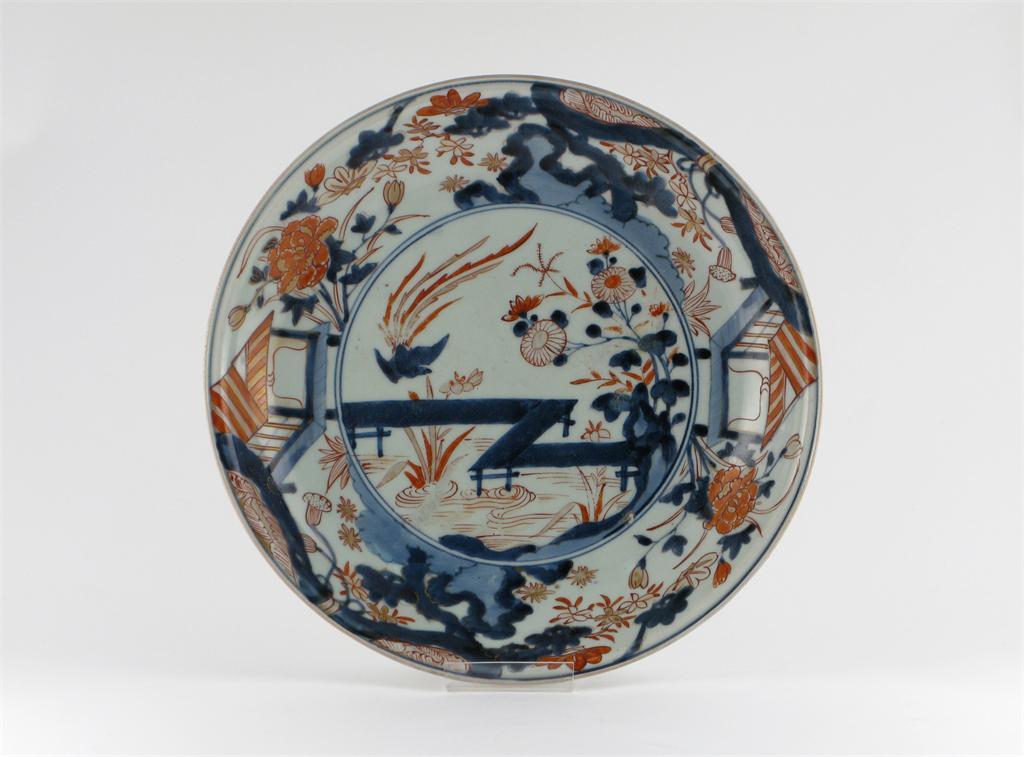 A Japanese Imari dish, painted with a phoenix above a pond, within a border of flowers and rockwork, c.1700, surface wear, 32cm.