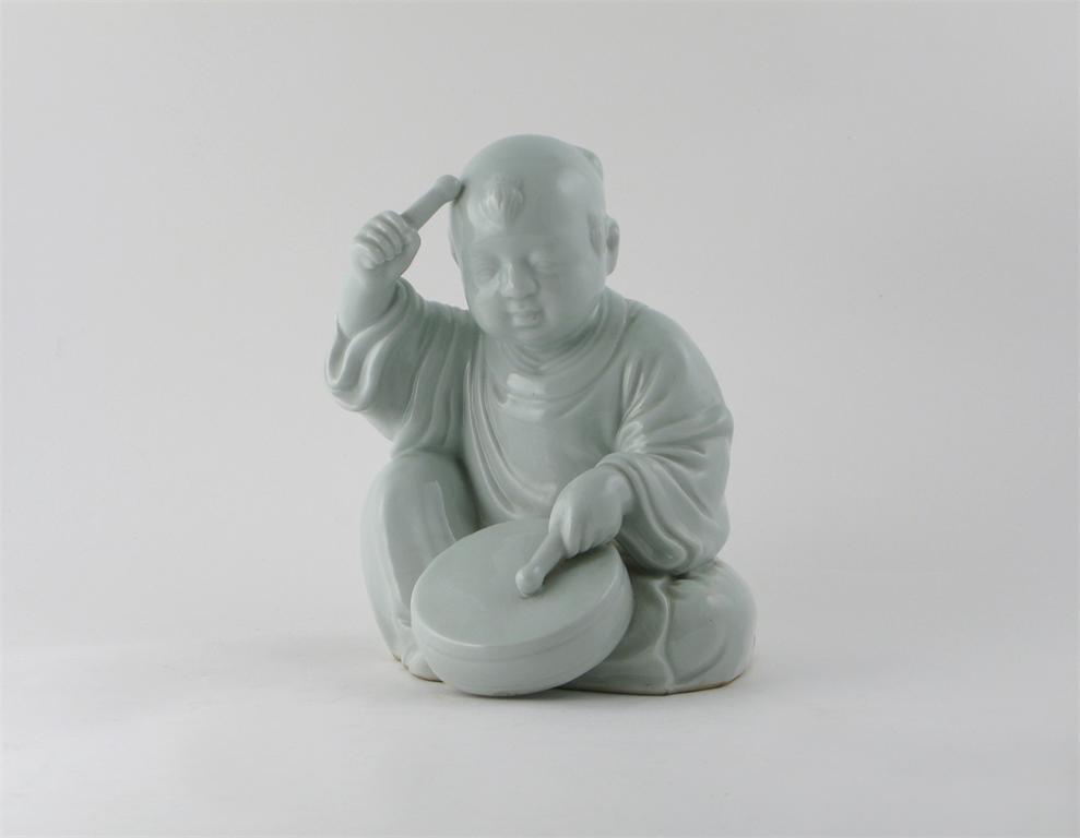 A Japanese white-glazed porcelain model of a boy, beating a drum, which rests upon his knee, c.1900, 23cm.