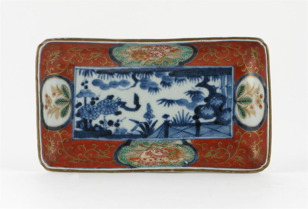 A Japanese Imari rectangular dish, painted with a panel of pine, bamboo, and other flowers within an iron red and gilt border, a four character mark, 18th century, 21cm.