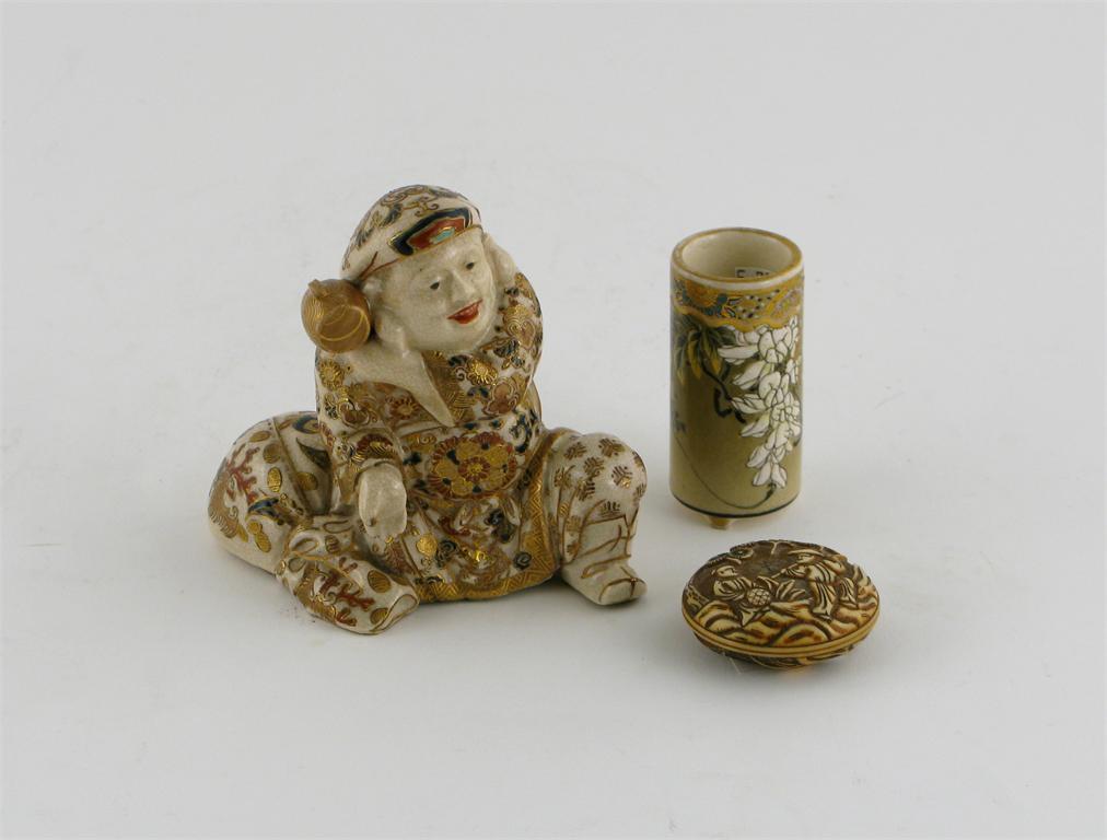 A Japanese Satsuma kneeling figure of Daikoku, a small cylindrical Satsuma vase and an ivory manju netsuke, 19th/20th century, 10cm. (3)