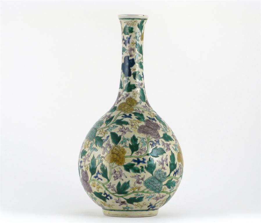 A Chinese famille verte bottle vase, painted with a flowering peony scroll and stylized ruyi fungus, the ground with a mottled yellow glaze, 19th century, 30.5cm.