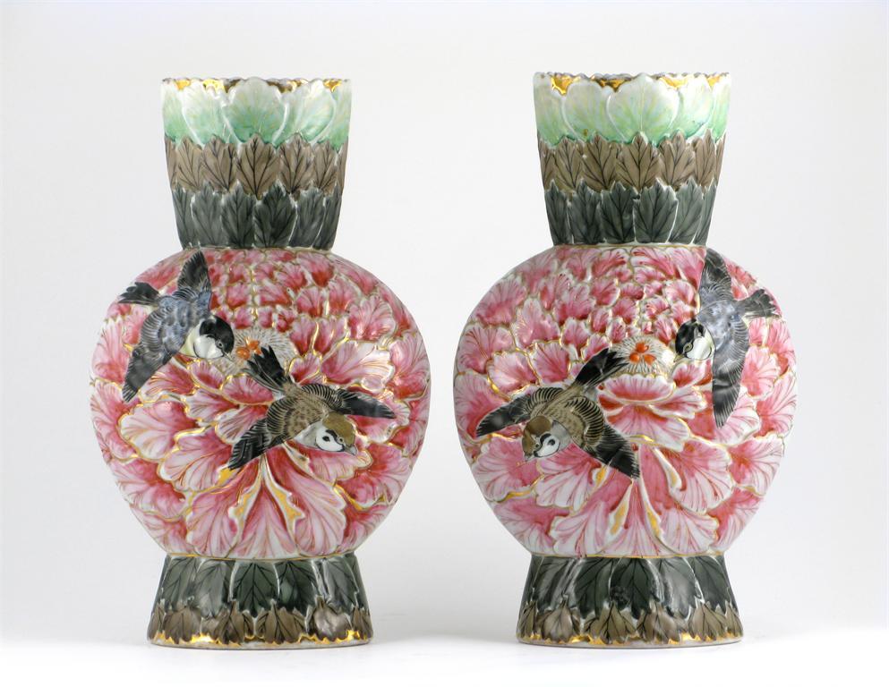 A pair of Chinese moulded vases, the bodies as massive pink and orange flower heads, with petals and leaves in relief, a sparrow and great tit painted on both sides, 20th century, one vase with a 3cm chip and extending 6cm hairline, 31.5cm. (2)