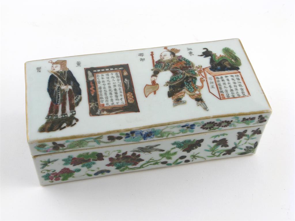 A Chinese Canton famille rose pen box and cover, the top painted with two figures and panels of calligraphy, the sides decorated with birds, flowers and foliage, 19th century, 19.5cm. (2)