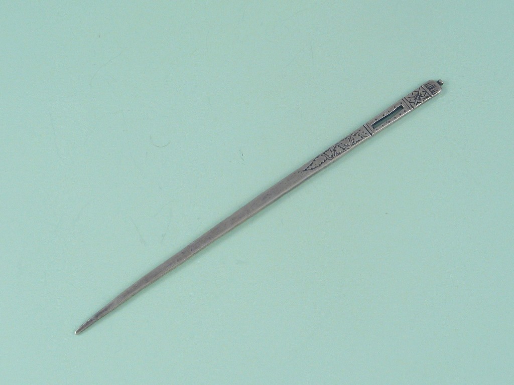 An Elizabeth I/James I bodkin, with an engraved upper section and a narrow oblong slot, unmarked, 1600-1620, 6.25in (15.7cm) long, 0.5oz.