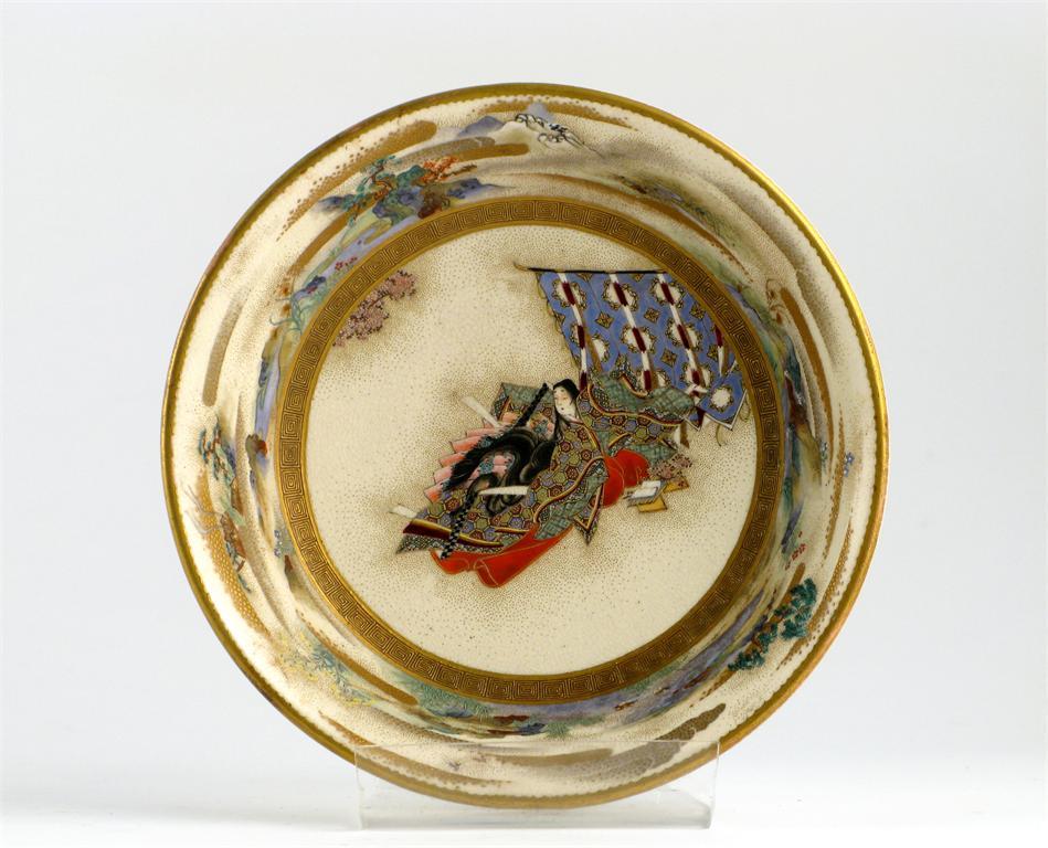 A Japanese Satsuma dish, painted with a kneeling lady with long hair and wearing flowing robes, with a gilt key fret border and mountainous landscape scenes, signed, Meiji 1868-1912, 13.8cm.