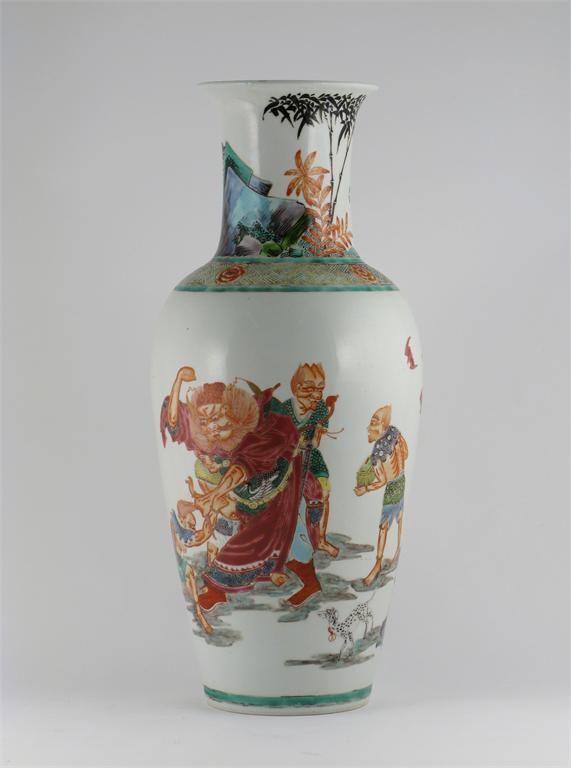 A Chinese famille rose baluster vase, painted with figures and animals, the reverse with rock work and pine, 20th century, 46cm.