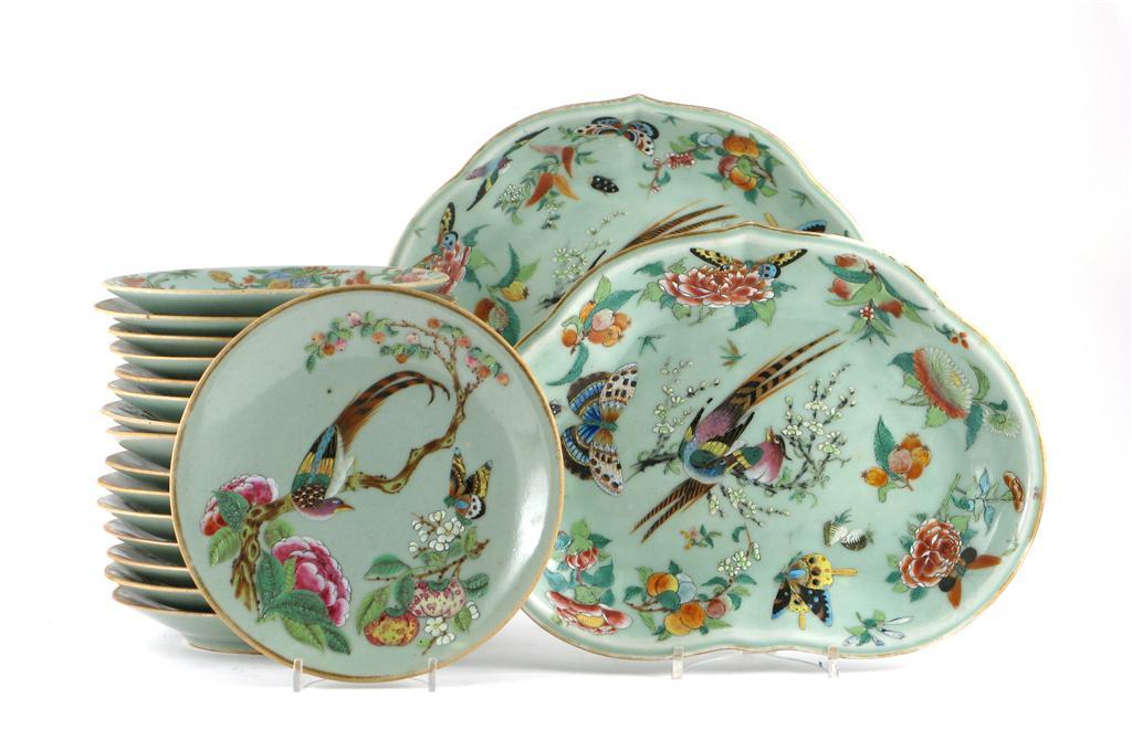 A pair of Chinese Canton heart-shaped dishes, and sixteen plates, painted with birds, flowers, fruit and insects in the famille rose palette on a celadon ground, 2nd half 19th century, most with rubbing to the gilt rims, one plate with a 4mm flake, another with a 3cm body crack and another with a 1cm chip, 28.3cm max. (18)
