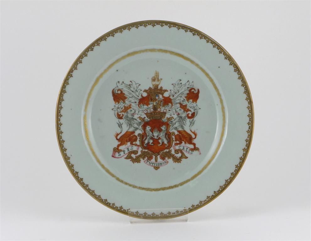 A pair of Chinese armorial plates, painted with the arms of the King of Rockingham, gilt scroll and spearhead borders, c.1748, one damaged, 23cm. (2) Cf. D.S. Howard, p.292, G2.