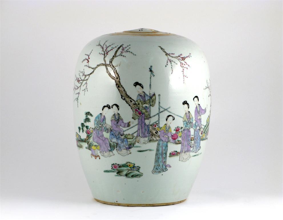 A Chinese ovoid jar and cover, painted with a group of six ladies, the reverse with five rows of calligraphy, the lid with four characters, the base with a stamped seal mark, some rubbing to the gilding, 1st half 20th century, 28cm. (2)