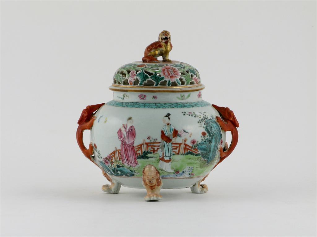 A Chinese famille rose tripod censer, the reticulated cover with a lion dog finial, the handles formed as red kylin, and the body painted with figures in a garden, all raised on three lion paw feet, 18th century, 15cm. (2)