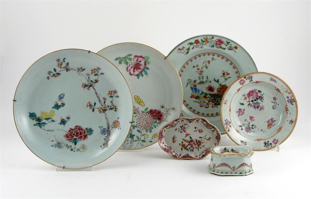 Chinese famille rose, variously decorated with flowers, vases and foliage, all 18th century, 23cm max. Comprising: two saucer dishes, a plate, a small bowl, a trencher salt and a spoon tray. (6)