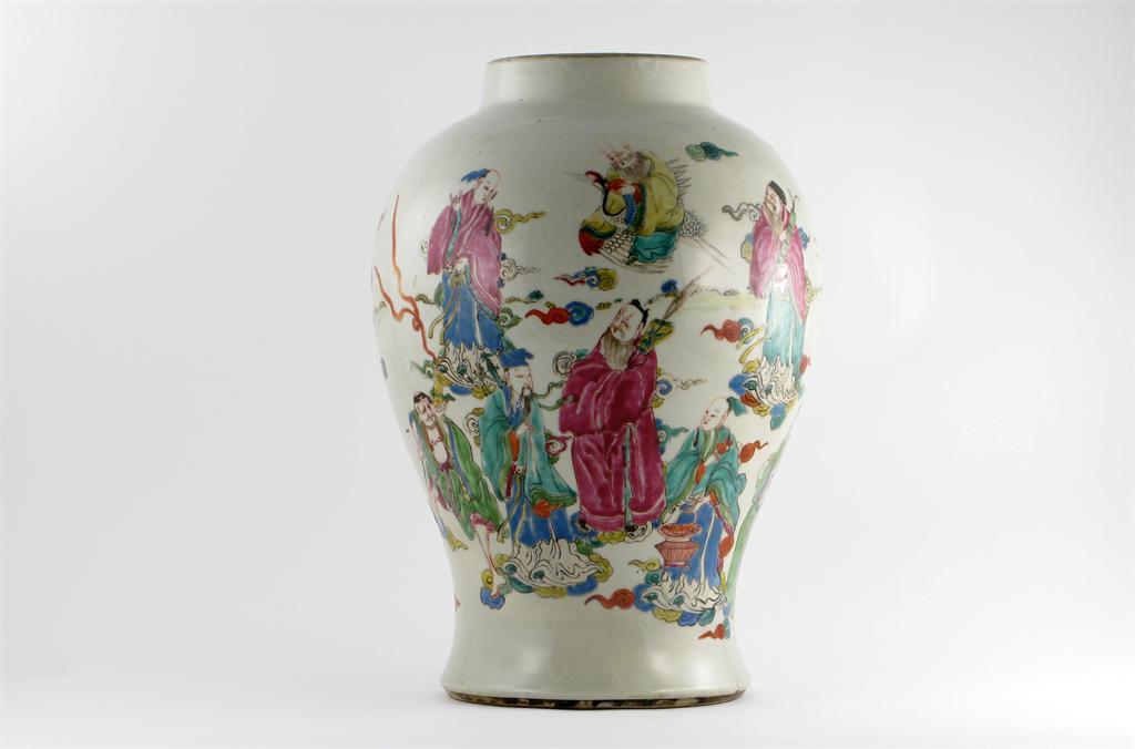 A Chinese famille rose baluster vase, painted with Shoulao riding a crane, above the eight Daoist immortals, Yongzheng c.1730, restored around the body, 36cm.