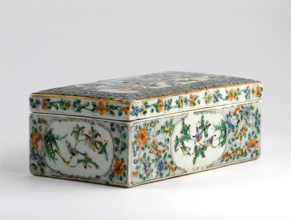 A Chinese Canton rectangular box and cover, painted in the famille verte palette with shaped panels containing figures and birds, the ground with a geometric and flower strewn pattern, the box with a dividing section, 19th century, some losses to the paint and gilding, 19.2cm. (2)