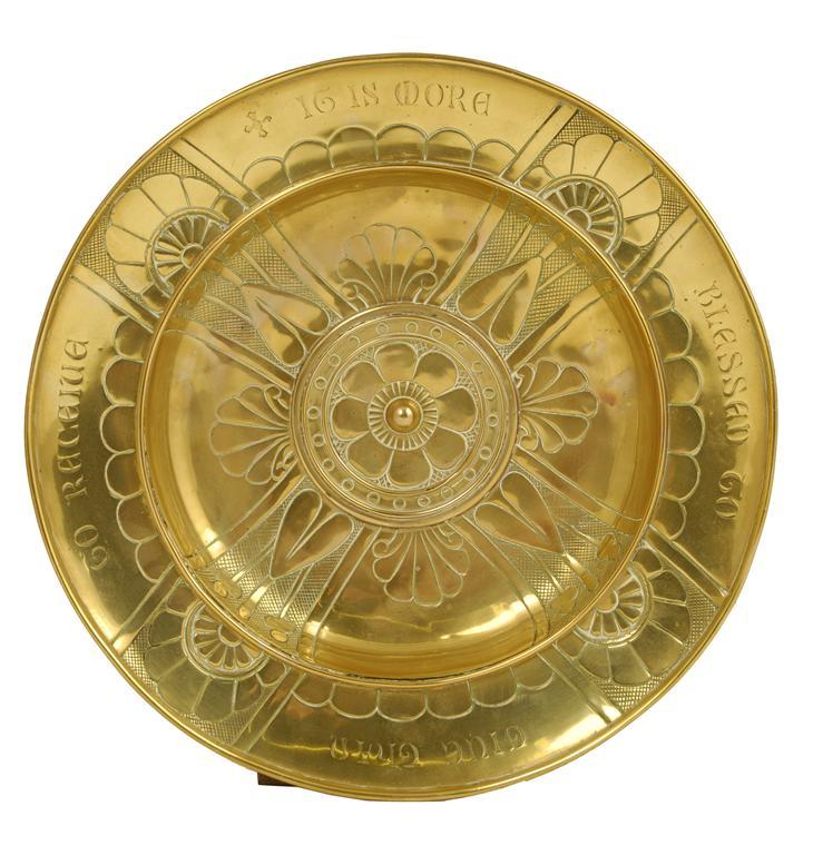 A late Victorian circular brass offering plate, with a floret boss and radiating stylized foliage, the border inscribed 'IT IS MORE / BLESSESD TO / GIVE THAN / TO RECEIVE', 9in (23cm) dia.