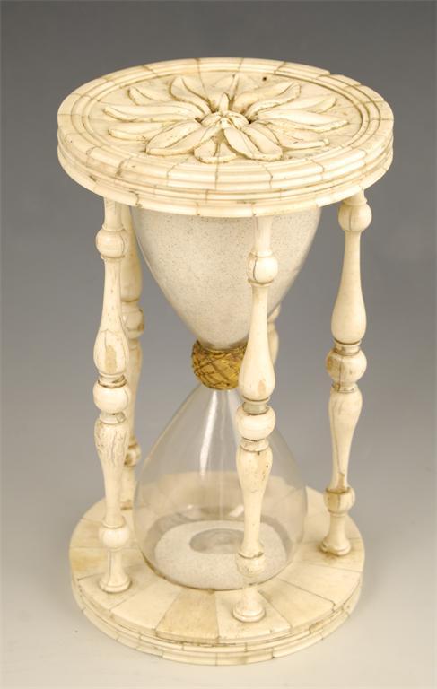An ivory and bone hour glass, the circular ends with a flowerhead design having turned supports, 8in (20.5cm) h, 4.75in (12cm) dia.