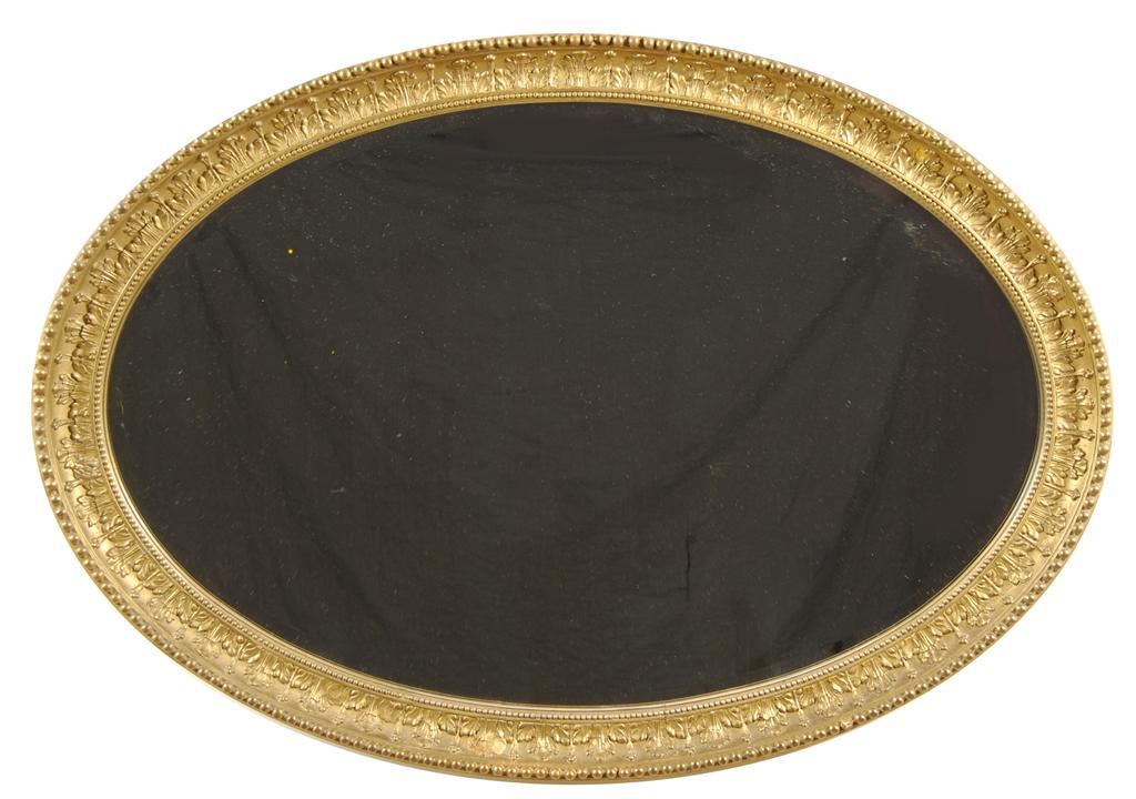 A late Victorian giltwood and gesso oval wall mirror, with a bevelled plate and bead edges with a leaf and bud border, 27.75 x 39.5in (70.5 x 100cm).