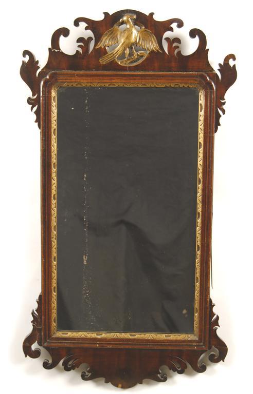 An 18th century style mahogany and parcel gilt fret frame wall mirror, the rectangular plate to a carved ho-ho bird surmount, 34.5 x 18.75in (87.5 x 47.5cm). Damages and restorations.