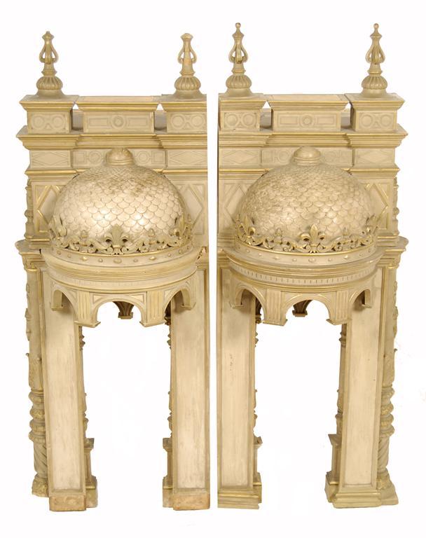 Two carved wood and painted architectural models of classical arches, with pierced finials and apsidal arches adorned with fleur-de-lys, 40in (101.5cm) h, 14.25in (36cm) w, 18in (46cm) d. Damages and losses, probably part of a larger model. (2)