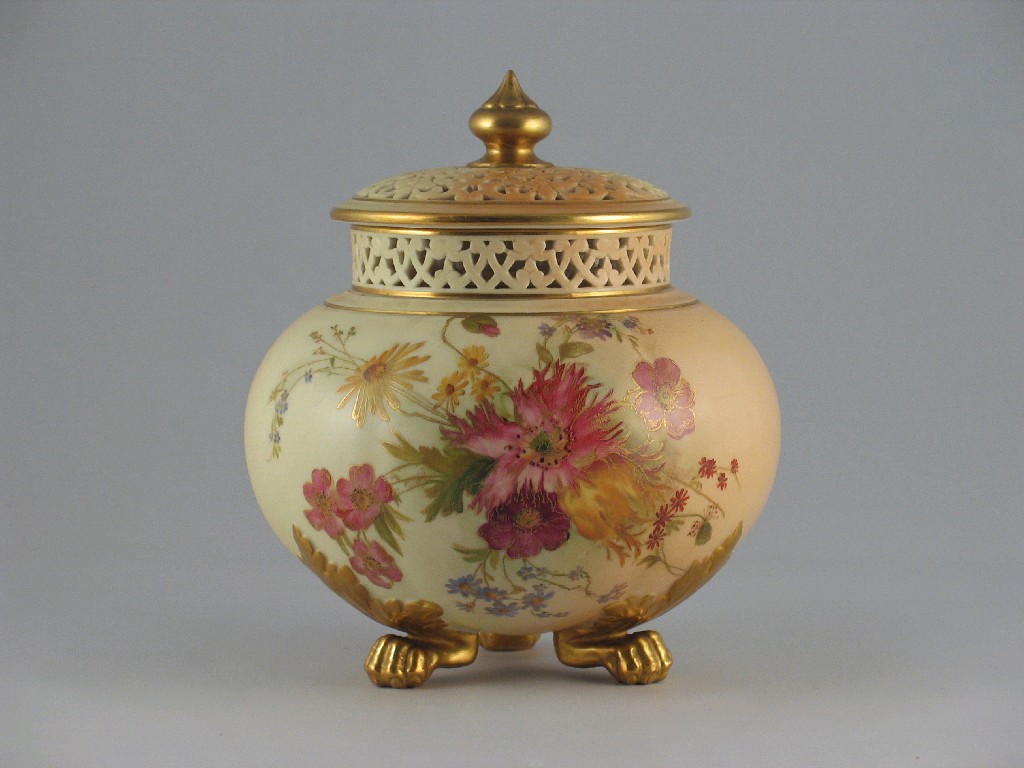 A Royal Worcester pot pourri vase, cover and inner lid , decorated with flowers and raised on three feet, c.1908, 18cm. (3)