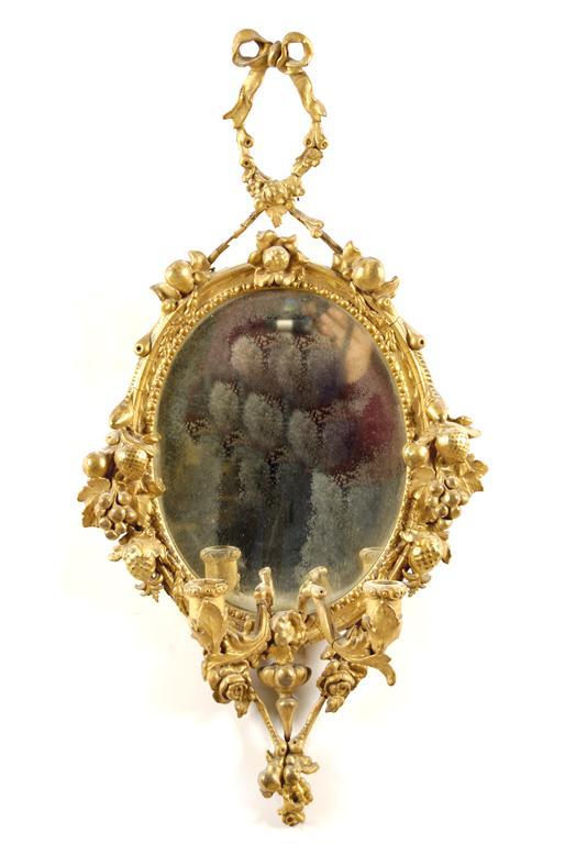 A 19th century giltwood and gesso oval girandole, the ribbon tied crest to a leaf and berry carved frame with twin branch candle holders to a flower and fruit carved base, 29.75 x 15.25in (75.5 x 38.5cm). Losses and restoration.
