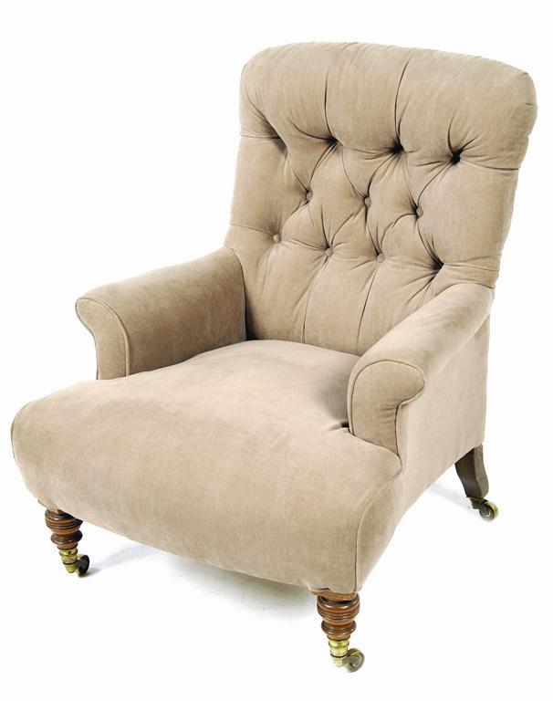Howard & Sons. A late Victorian easy armchair, with later button back upholstery, on turned walnut supports and brass caps and castors, the back left leg stamped '12478 8620 HOWARD & SONS LTD, BERNERS ST.', three castors stamped 'HOWARD & SONS LONDON'.