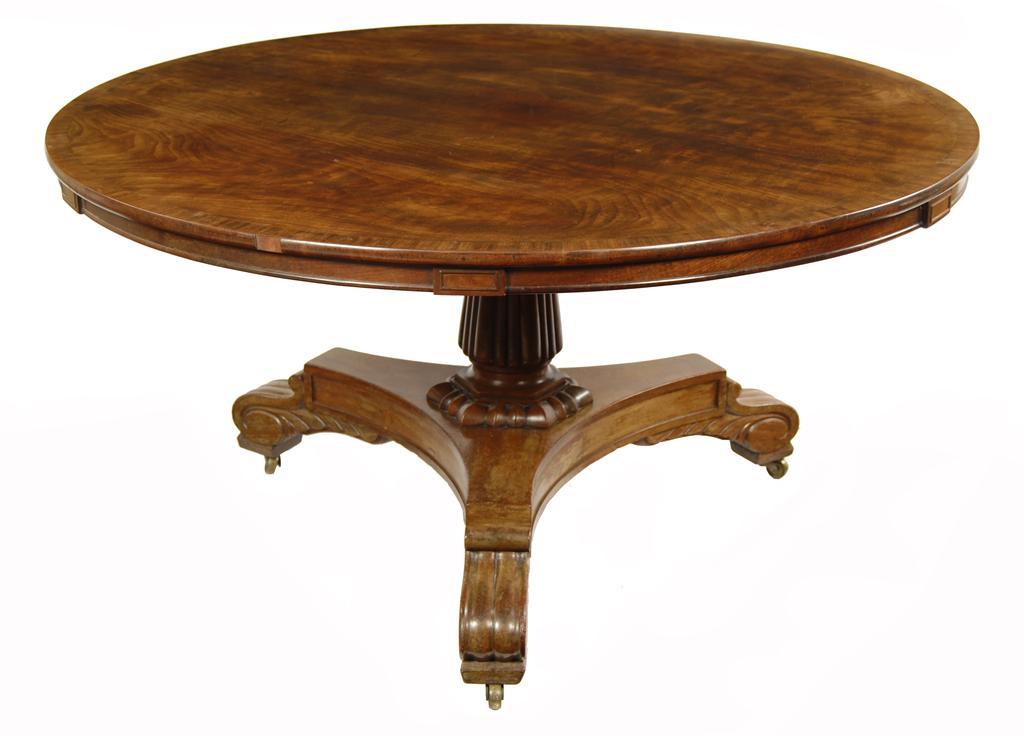 A George IV mahogany breakfast table, the circular crossbanded tilt-top above a frieze with applied tablets, on a reeded stem and panelled triform base to carved scroll feet and brass castors, 27.25in (69.3cm) h, 53.75in (136.3cm) dia. One bearer replaced, stem possibly replaced. Provenance: Great Brampton House Antiques, Madley, Hereford, 1974.