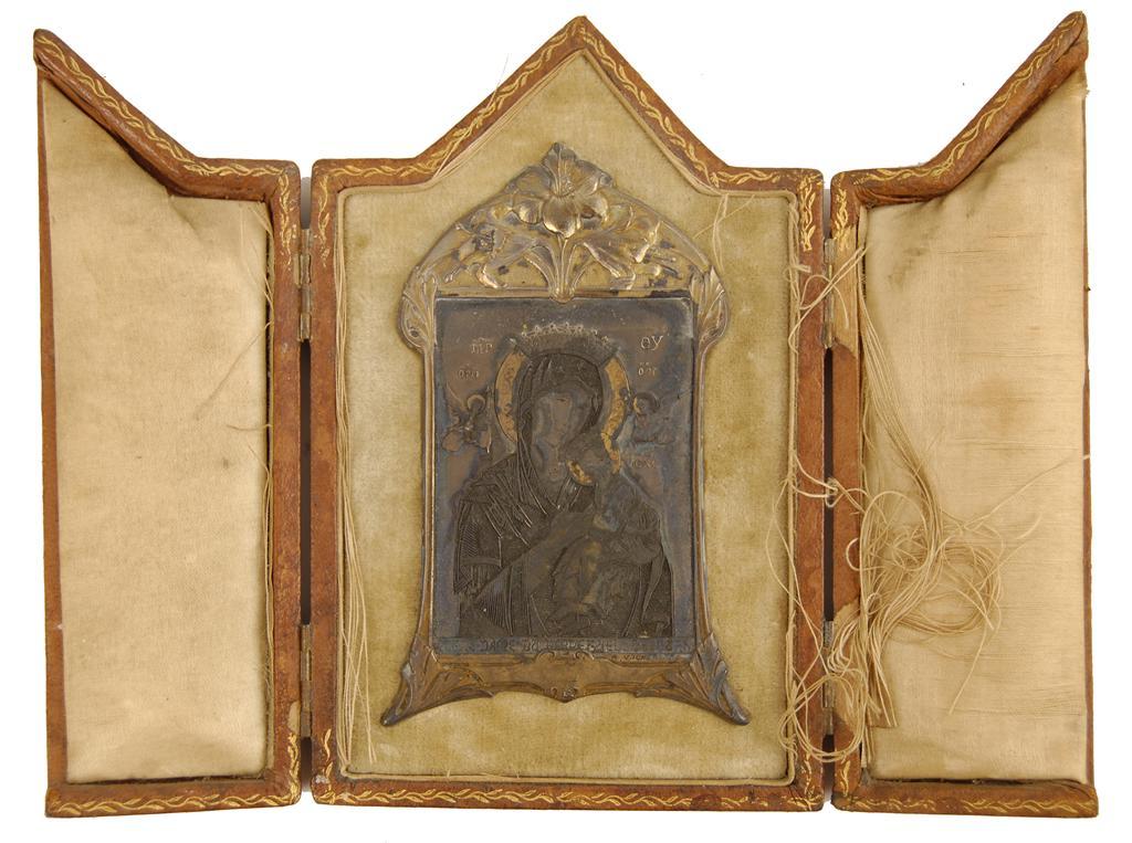 A silver coloured metal icon, depicting the Virgin Mary with baby Jesus, within an Art Nouveau frame, inscribed 'B. Wicker GR'. 3.75in (9.5cm) h, in a folding leather frame.
