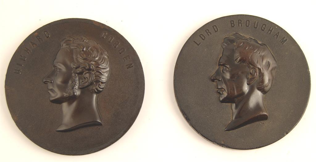 Two bois durci circular portrait medallions, Lord Brougham and Richard Cobden, 4.5in (11.5cm) dia.