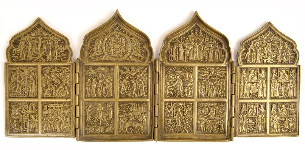 An orthodox brass folding icon, having an ogee top above four panels each depicting different scenes with Cyrillic text, 6.75in (17cm) h.