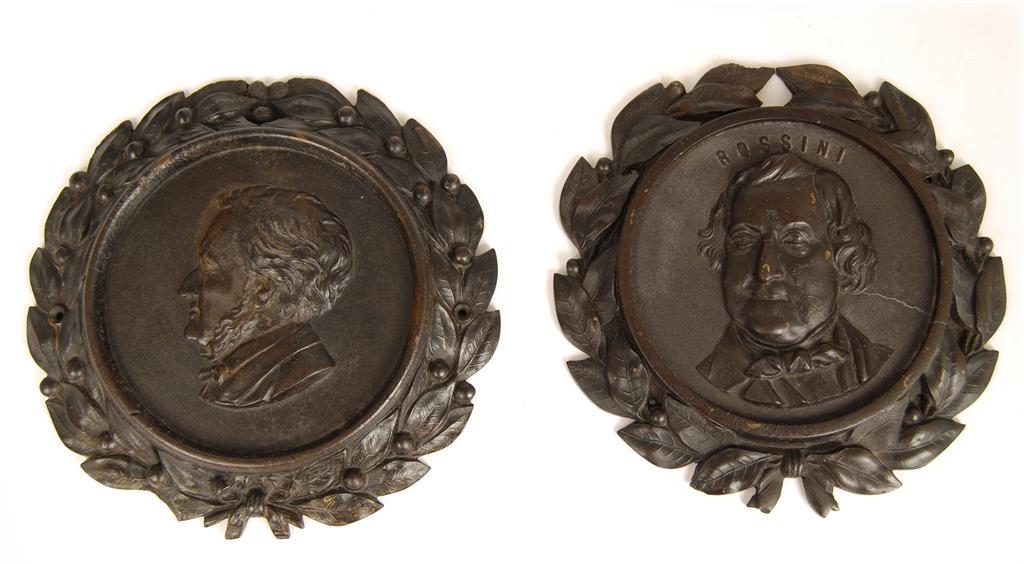 A bois durci portrait medallion, Rossini, with a laurel wreath border, 6.5in (16.5cm) dia, and another depicting Wagner. (2)