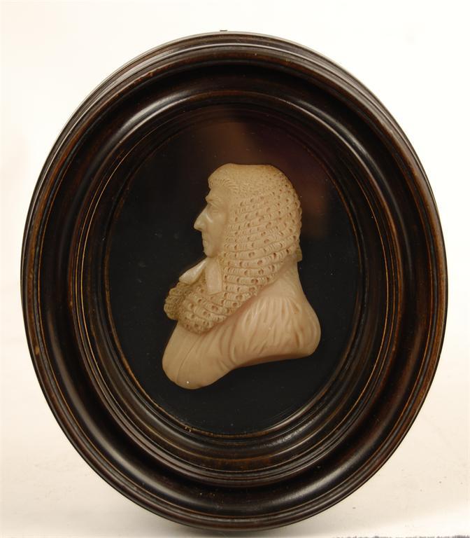 A wax portrait bust of a gentleman wearing a judicial wig, 3in (7.5cm) h, in an oval frame. Provenance: Mary Bate Collection.