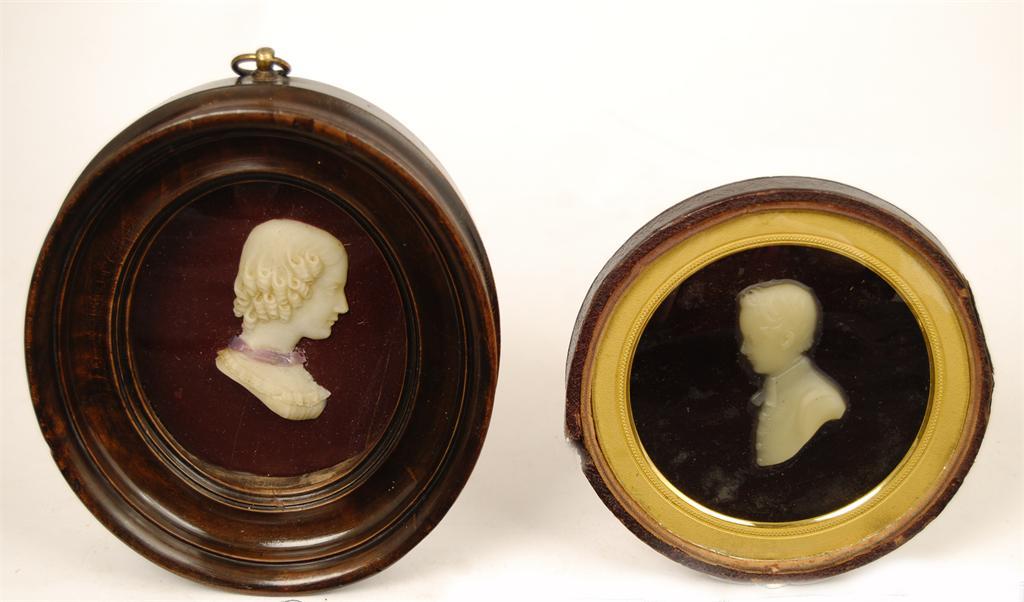 An early 19th century wax portait bust, of a young girl with ringleted hair, 2.5in (6cm) h, in an oval frame and the back inscribed 'Maria L. Haye 1829 aged 14' and a wax portrait of a young boy. (2)