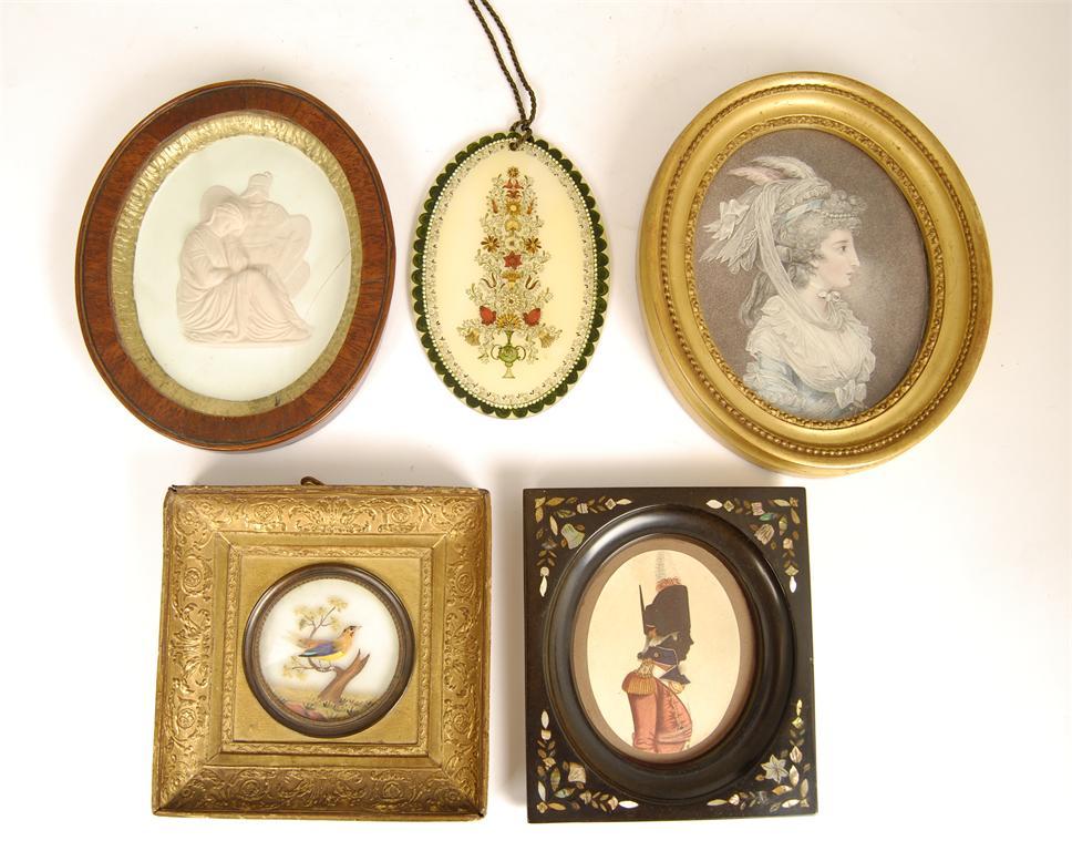 A feather and painted behind glass picture, of a bird on a branch, 2.5in (6cm) dia, an oval plaster memento mori relief, 5.25in (13cm) h, an ebonised frame with abalone inlay, an oval print of a lady and an oval glass panel. (5)