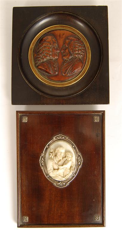 A European relief carved ivory plaque, depicting St Anthony holding Jesus, who together are holding a lily, 2in (5cm) h, with silver coloured metal mount and mahogany panel, and a releif carved boxwood double portrait bust plaque, 2.75in (7cm) dia, framed. (2)