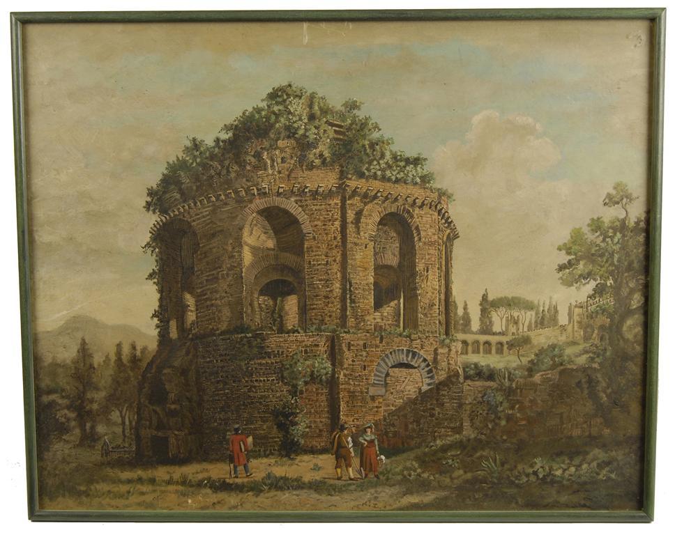 Two painted over engravings, 'The Tomb of Cecelia Metella' and 'The Ruins of an Aquaduct', 20.5 x 25.5in (52 x 65cm). (2)