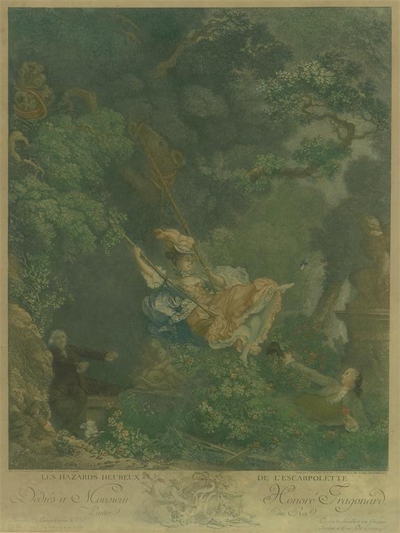 After Fragonard 'The Swing', colour print, 16 x 12in (40.6 x 30.5cm) and a companion print, in giltwood frames.