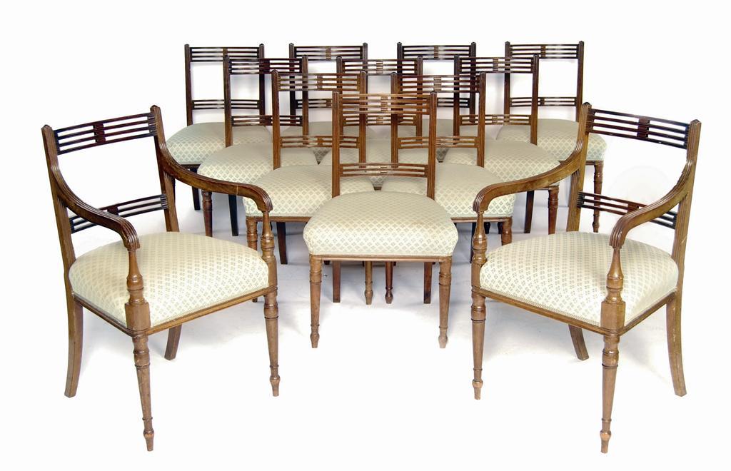 A set of twelve early 19th century mahogany dining chairs, with bowed reeded bar backs and reeded supports to stuffed over seats on turned tapering legs, comprising: a pair of open armchairs and ten side. (12)