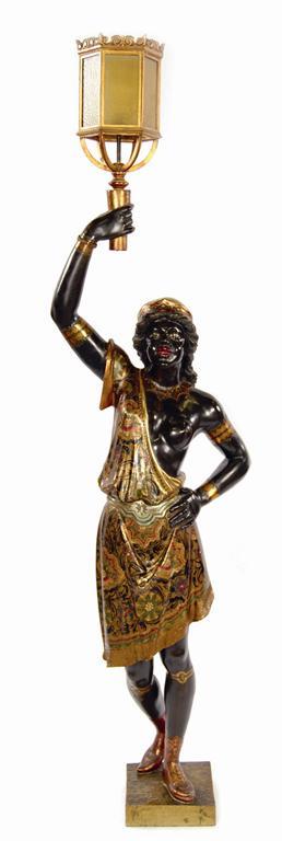 A Venetian carved wood and polychrome decorated blackamoor torchere, fitted for electricity, early 20th century, 70.5in (179cm) h, 19.5in (49.5cm) w.