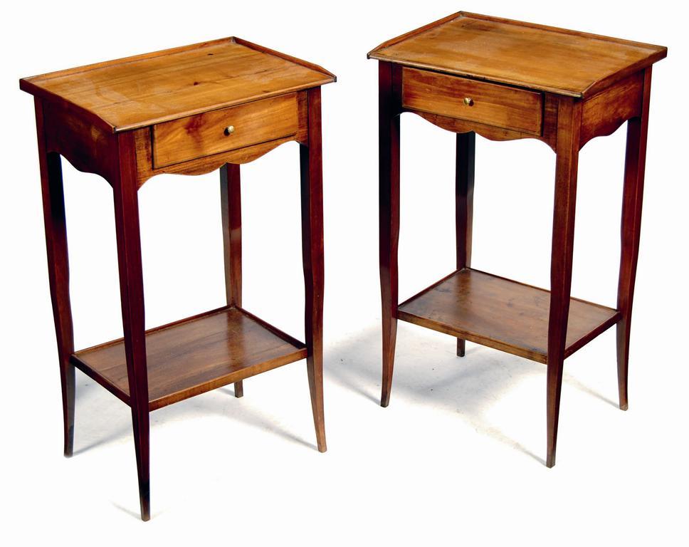 A pair of French cherrywood bedside tables, each with a frieze drawer, 20th century, 25.75in (65.5cm) h, 15.75in (40cm) w, 11.25in (28.5cm) d. (2)