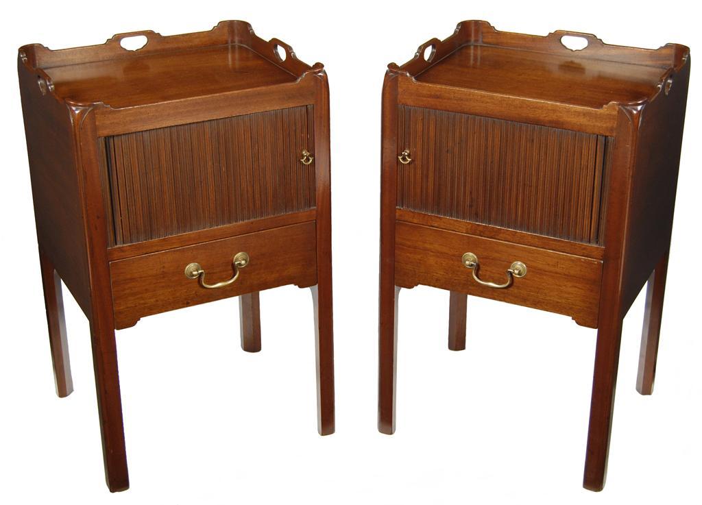 A pair of George III style mahogany 'tray top' bedside tables, each with a tambour shutter above a drawer, modern, 31in (78.6cm) h, 19in (48cm) w, 17in (43cm) d. (2)