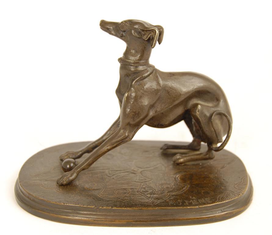 After Pierre Jules-Mene (1810-1879). Whippet with a ball, on an oblong base, bronzed iron, 4.5in (11.5cm) h, 6in (15cm) l.